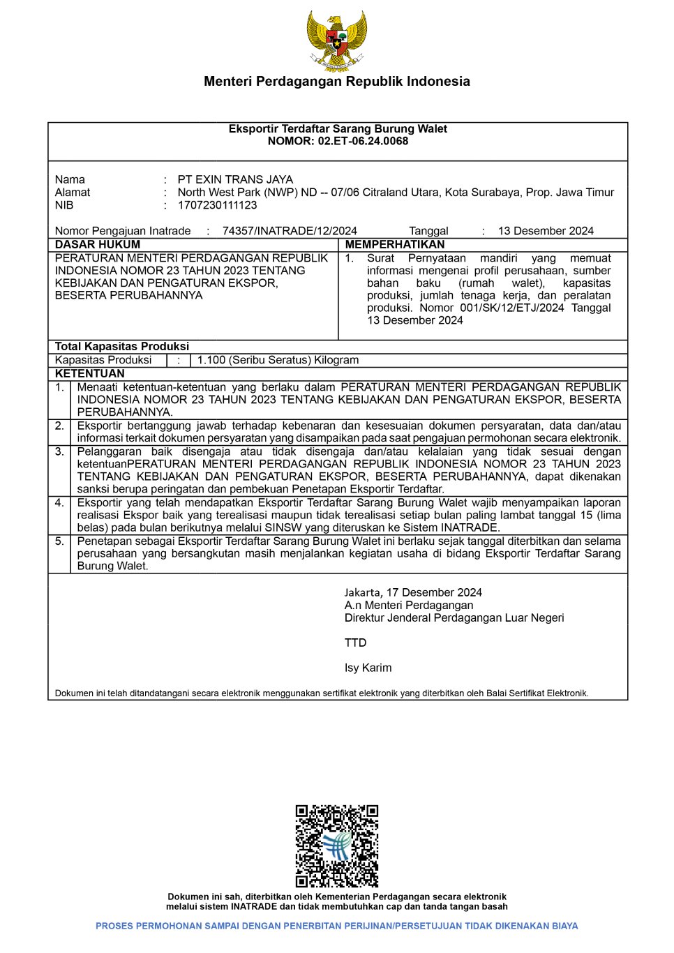 Golden 88 Nest has officially listed as edible bird's nest registered exporter in Trade and Industry